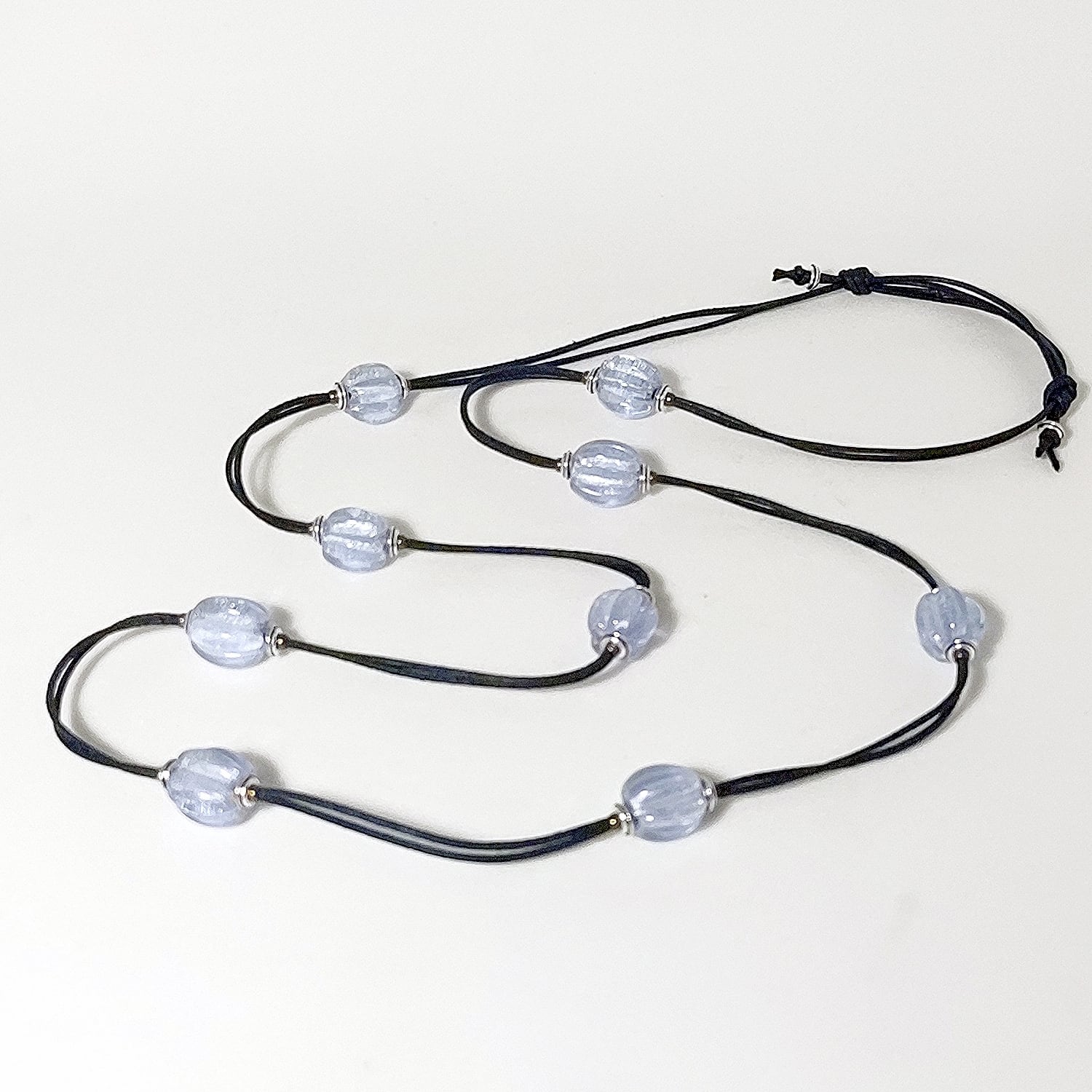 上品な薄紫、薄青のガラスに銀箔をはさみ切り込みを入れた小玉を9個連ねた、ロングタイプのステーションネックレスです。